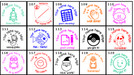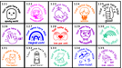 Our personalised round stamps come in three sizes: 28mm and 32mm. Each stamp is pre-inked and ready to use, with seven vibrant ink colours to choose from.